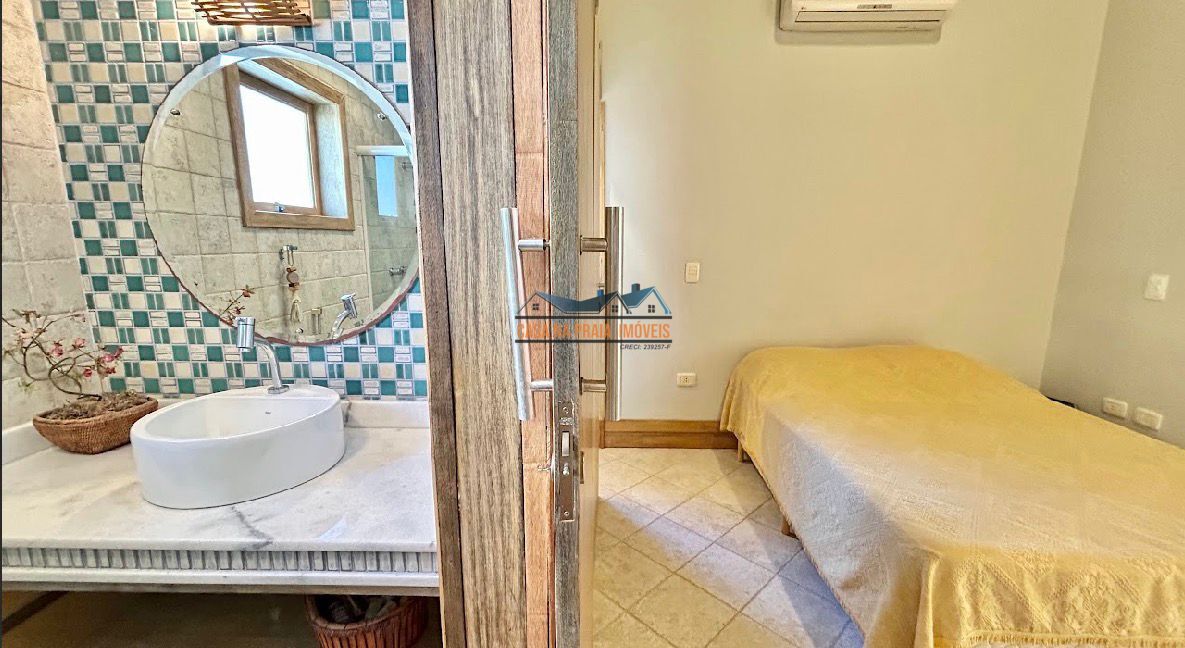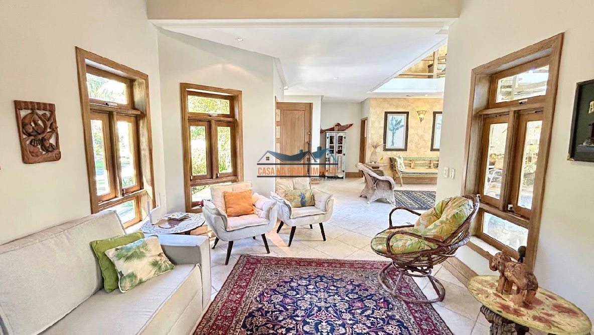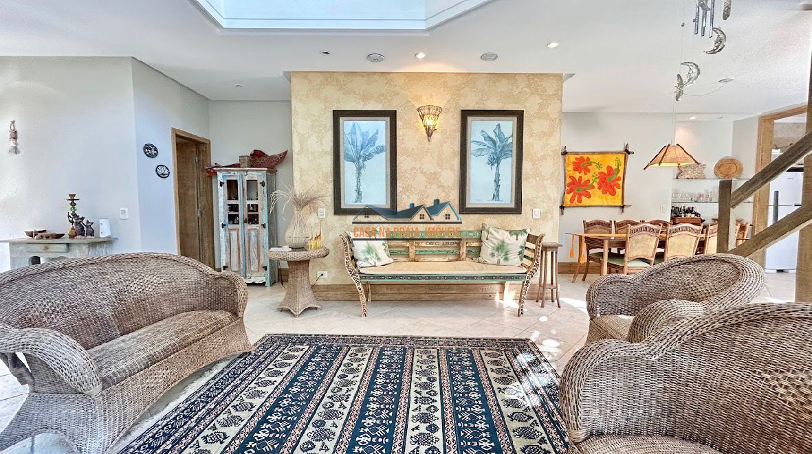 Com arquitetura praiana típica da região, o imóvel valoriza elementos como vidro, madeira e mobiliário que evocam o estilo caiçara, criando uma atmosfera leve, elegante e perfeitamente integrada ao entorno natural.